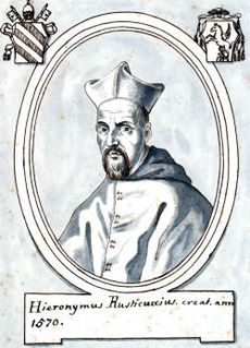 Girolamo Rusticucci was an Italian Roman Catholic cardinal and bishop. He was personal secretary to Cardinal Michele Ghislieri, later Pope Pius V, who made Rusticucci a cardinal. He occupied numerous important positions, including papal legate to France and Spain, Camerlengo (treasurer) and Vice-Dean of the College of Cardinals, and Vicar General of Rome.