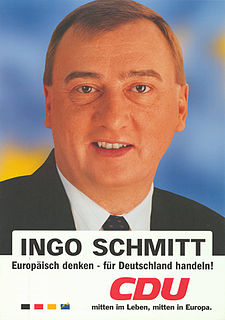 Ingo Schmitt is a German politician who was Member of the European Parliament for Berlin from 1999 to 2005. On 18 September 2005 he was elected to the Bundestag and consequently resigned from the European Parliament. He is a member of the conservative Christian Democratic Union.