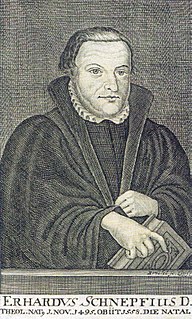 Erhard Schnepf was a German Lutheran Theologian, Pastor, and early Protestant reformer. He was among the earliest followers of Luther convinced to his views at the 1518 Heidelberg Disputation.