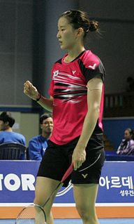 Chang Ye-na is a South Korean badminton player who specializes in doubles. She competed at the 2016 Summer Olympics in Rio de Janeiro, Brazil. She won gold medals at the 2013 Kazan Universiade in the mixed team and women's doubles event partnered with Kim So-yeong. She also won silver medal at the 2013 BWF World Championships with Eom Hye-won. In 2017, she helped the Korean national team to win the world team championships at the Sudirman Cup.