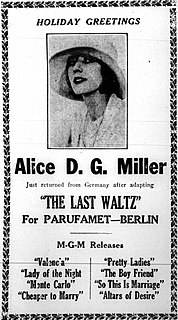 Alice D. G. Miller was an early American screenwriter. She was sometimes erroneously credited as Alice Duer Miller, another writer of no relation.