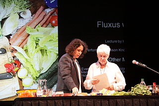 Alison Knowles is an American visual artist known for her installations, performances, soundworks, and publications. Knowles was a founding member of the Fluxus movement, an international network of artists who aspired to merge different artistic media and disciplines. Criteria that have come to distinguish her work as an artist are the arena of performance, the indeterminacy of her event scores resulting in the deauthorization of the work, and the element of tactile participation. She graduated from Pratt Institute in New York with an honors degree in fine art. In May 2015, she was awarded an honorary doctorate degree by Pratt.