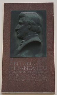 Antun Mihanović was a Croatian poet and lyricist, most famous for writing the national anthem of Croatia, which was put to music by Josif Runjanin and adopted in 1891. Klanjec, his birthplace, holds a monument to him and a gallery of his works.