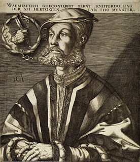 Bernhard Knipperdolling was a German leader of the Münster Anabaptists. He was also known as Bernd or Berndt Knipperdollinck or Knypperdollynck or Bertrand Knipperdoling; his birth name was van Stockem.