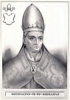 Pope Boniface VI was the bishop of Rome and ruler of the Papal States in April 896. He was a native of Rome. His election came about as a result of riots soon after the death of Pope Formosus. Prior to his reign, he had twice incurred a sentence of deprivation of orders as a subdeacon and as a priest. After a pontificate of fifteen days, he is said by some to have died of the gout, by others to have been forcibly ejected to make way for Stephen VI, the candidate of the Spoletan party.