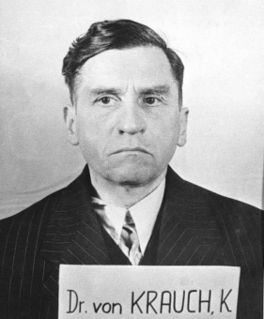 Carl Krauch was a German chemist, industrialist and Nazi war criminal. He was an executive at BASF ; during World War II, he was chairman of the supervisory board. He was a key implementer of the Reich’s Four-Year Plan to achieve national economic self-sufficiency and promote industrial production. He was Plenipotentiary of Special Issues in Chemical Production, a senator of the Kaiser Wilhelm Society, and an honorary professor at the University of Berlin. He was convicted in the IG Farben trial after World War II and sentenced to six years in prison.
