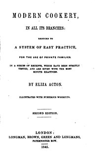 Eliza Acton was an English food writer and poet who produced one of Britain's first cookery books aimed at the domestic reader, Modern Cookery for Private Families. The book introduced the now-universal practice of listing ingredients and giving suggested cooking times for each recipe. It included the first recipes in English for Brussels sprouts and for spaghetti. It also contains the first recipe for what Acton called "Christmas pudding"; the dish was normally called plum pudding, recipes for which had appeared previously, although Acton was the first to put the name and recipe together.
