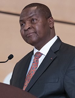 Faustin-Archange Touadéra is a Central African politician and academic who has been President of the Central African Republic since March 2016. He was previously Prime Minister of the country from January 2008 to January 2013. In the December 2015–February 2016 presidential election, he was elected as President in a second round of voting against former Prime Minister Anicet Georges Dologuélé. He was re-elected for a second term on 27 December 2020.