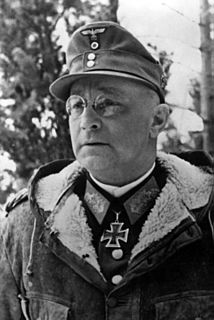 Franz Halder was a German general and the chief of staff of the Army High Command (OKH) in Nazi Germany from 1938 until September 1942. After World War II he had a decisive role in the development of the myth of the clean Wehrmacht. He directed the planning and implementation of Operation Barbarossa, the 1941 invasion of the Soviet Union. Halder became instrumental in the radicalisation of warfare on the Eastern Front. He had his staff draft both the Commissar Order and the Barbarossa Decree that allowed German soldiers to execute Soviet citizens for any reason without fear of later prosecution, leading to numerous war crimes and atrocities during the campaign.