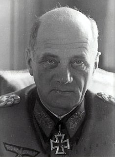 Hans Eberhard Kurt Freiherr von Salmuth was a German general and war criminal during World War II. Salmuth commanded several armies on the Eastern Front, and the Fifteenth Army in France during the D-Day invasion. Following the war, he was tried in the High Command Trial, as part of the Subsequent Nuremberg Trials. He was found guilty of war crimes and crimes against humanity and sentenced to 20 years. He was released in 1953.