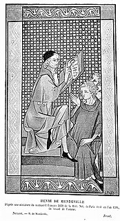 Henri de Mondeville was a medieval French surgeon who made a significant number of contributions to anatomy and surgery, and was the first Frenchman to author a surgical treatise, La Chirurgie (1306-1320). Very little is known about the details of his early life. There is some doubt about his birthplace as according to ancient Norman custom, his last name is derived from the place of birth, and is variously spelled as Amondeville, Esmondeville, Mandeville and so on.