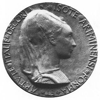 Isotta degli Atti was an Italian Renaissance woman and regent. She was the mistress and later wife of the condottiero and lord of Rimini, Sigismondo Pandolfo Malatesta. She governed Rimini as regent during the excommunication of Malatesta in 1437, as well as during the minority of their son in 1468–69.