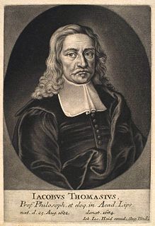 Jakob Thomasius was a German academic philosopher and jurist. He is now regarded as an important founding figure in the scholarly study of the history of philosophy. His views were eclectic, and were taken up by his son Christian Thomasius.