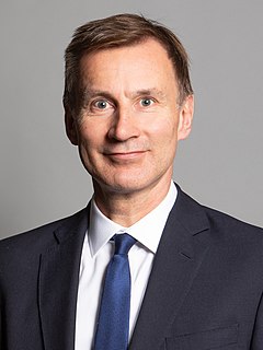 Jeremy Richard Streynsham Hunt is a British politician serving as Member of Parliament (MP) for South West Surrey since 2005. A member of the Conservative Party, he served in the Cabinet from 2010 to 2019, most recently as Foreign Secretary from 2018 to 2019. He identifies as a one-nation conservative, and has been associated with economically liberal and socially liberal policies. Hunt was a candidate for Leader of the Conservative Party, and Prime Minister, in the 2019 leadership contest, losing to Boris Johnson.