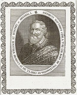 Count Jindřich Matyáš Thurn-Valsassina, was a Czech (Bohemian) nobleman, one of leaders of Protestant Bohemian Revolt against Emperor Ferdinand II. He took part in events that led to the Thirty Years War, and after the war he became a military leader and diplomat in Swedish service, who eventually resided in Swedish Estonia.