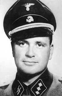 Kurt Meyer was an SS commander and war criminal of Nazi Germany. He served in the Waffen-SS and participated in the Battle of France, Operation Barbarossa, and other engagements during World War II. Meyer commanded the 12th SS Panzer Division Hitlerjugend during the Allied invasion of Normandy, and was a recipient of the Knight's Cross of the Iron Cross with Oak Leaves and Swords.
