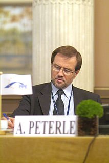 Alojz "Lojze" Peterle is a Slovenian politician. He is a member of New Slovenia, part of the European People's Party. He served as Prime Minister of Slovenia from 1990 to 1992, Leader of the Christian Democrats from the founding of the party in 1990 until it merged with the Slovenian People's Party in 2000, and was Minister of Foreign Affairs from 1993 to 1994 and again in 2000. He was a Member of the National Assembly from 1996 to 2004, and a Member of the European Parliament from 2004 to 2019.