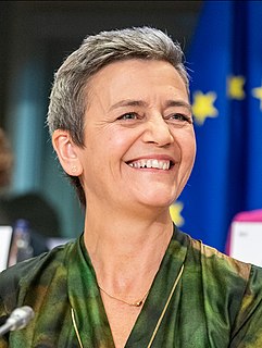 Margrethe Vestager is a Danish politician and European Commissioner in the Von der Leyen Commission, currently serving as Executive Vice President of the European Commission for A Europe Fit for the Digital Age since December 2019 and European Commissioner for Competition since 2014. Vestager is a member of the Danish Social Liberal Party, and of the Alliance of Liberals and Democrats for Europe Party (ALDE) on the European level.
