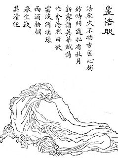 Meng Haoran was a major Tang dynasty poet, and a somewhat older contemporary of Wang Wei, Li Bai and Du Fu. Despite his brief pursuit of an official career, Meng Haoran mainly lived in and wrote about the area in which he was born and raised, in what is now Hubei province, China. Meng Haoran was a major influence on other contemporary and subsequent poets of the High Tang era because of his focus on nature as a main topic for poetry. Meng Haoran was also prominently featured in the Qing dynasty poetry anthology Three Hundred Tang Poems, having the fifth largest number of his poems included, for a total of fifteen, exceeded only by Du Fu, Li Bai, Wang Wei, and Li Shangyin. These poems of Meng Haoran were available in the English translations by Witter Bynner and Kiang Kanghu, by 1920, with the publication of The Jade Mountain. The Three Hundred Tang Poems also has two poems by Li Bai addressed to Meng Haoran, one in his praise and one written in farewell on the occasion of their parting company. Meng Haoran was also influential to Japanese poetry.