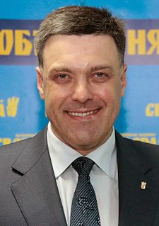 Oleh Yaroslavovych Tyahnybok is a Ukrainian politician who is a former member of the Verkhovna Rada and the leader of the nationalist far-right Svoboda political party. Previously he was elected councilman of the Lviv Oblast Council for the second session.