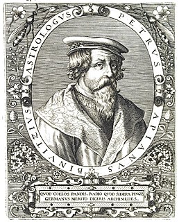 Petrus Apianus, also known as Peter Apian, Peter Bennewitz, and Peter Bienewitz, was a German humanist, known for his works in mathematics, astronomy and cartography. His work on "cosmography", the field that dealt with the earth and its position in the universe, was presented in his most famous publications, Astronomicum Caesareum (1540) and Cosmographicus liber (1524. His books were extremely influential in his time, with the numerous editions in multiple languages being published until 1609. The lunar crater Apianus and asteroid 19139 Apian are named in his honour.