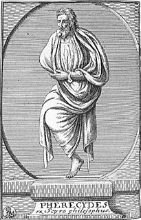 Pherecydes of Syros was a Greek or Syrian thinker from the island of Syros. Pherecydes authored a cosmogony, derived from three divine principles, Zas (Zeus), Cthonie (Earth) and Chronos (Time), known as the "Pentemychos". It formed a bridge between the mythological thought of Hesiod and pre-Socratic philosophy. His work is lost, but it survived into the Hellenistic period and we are informed on part of its content indirectly. Pherecydes was said to have been the first writer to communicate philosophical musings in prose. Aristotle regarded him partly a mythological writer and Plutarch, as well as many other writers gave him the title of Theologus.