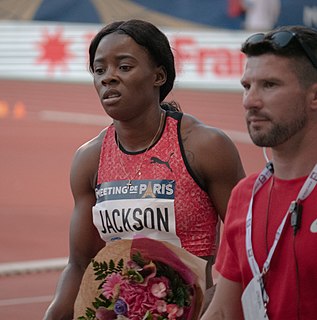 Shericka Jackson is a Jamaican sprinter specialising in the 400 metres and, since 2021, in shorter distances. In her longtime signature event of 400 m, she won bronze medals at the 2016 Olympics, 2015 World Championships and 2019 World Championships. At the same competitions, Jackson added medals in the 4 x 400 m relays, taking a silver, a gold and a bronze, respectively. She earned also a gold medal in the 4 x 100 m relay at the 2019 World Championship. In the 2021 season, she won a bronze medal in the 100 metres at the 2020 Tokyo Olympics.
