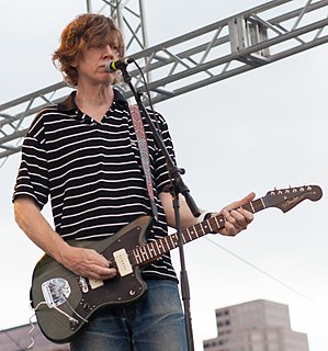 Thurston Joseph Moore is an American musician best known as a member of Sonic Youth. He has also participated in many solo and group collaborations outside Sonic Youth, as well as running the Ecstatic Peace! record label. Moore was ranked 34th in Rolling Stone's 2004 edition of the "100 Greatest Guitarists of All Time." In May 2012, Spin published a staff-selected list of the top 100 rock guitarists, and ranked Moore and his Sonic Youth bandmate Lee Ranaldo together at number 1.