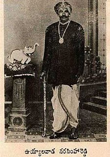 Uyyalawada Narasimha Reddy or majjari Narasimha Reddy was an Indian freedom fighter. Son of a former Telugu Palegaadu Mallareddy and Seethamma, Narasimha Reddy was born in Rupanagudi village, Uyyalawada Mandal, Kurnool district. He and his commander-in-chief Vadde Obanna were at the heart of the rebellion against British in 1847, where 5,000 peasants rose up against the British East India Company in Kurnool district, Rayalaseema Region of Andhra Pradesh. They were protesting against the changes introduced by the British to the traditional agrarian system in the first half of the nineteenth century. These changes include the introduction of the ryotwari system and other attempts to maximize revenue through exploiting lower-status cultivators by depleting their crops and leaving them impoverished. He killed over 3000 British people during the course of the revolt.