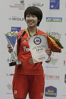 Wang Xin is a retired badminton player from China and former World No. 1 women's singles player. She was awarded as Best Female Players of the Year by the BWF in 2010. Wang represented China in the 2012 Summer Olympics and had to forfeit the match in the bronze medal playoff game against Saina Nehwal of India in which she was 21–18, 1–0 up, due to a knee injury.
